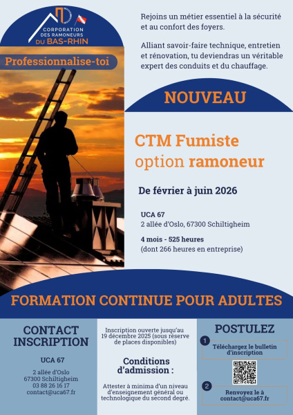 Formez-vous au métier de ramoneur en Alsace ! La CNRF vous offre deux options de formation : en apprentissage à la Chambre de Métiers d'Alsace pour les jeunes, ou en alternance en Haute-Savoie pour adultes. Obtenez le CTM Ramoneur, seul diplôme reconnu, et maîtrisez l'entretien de cheminée et le nettoyage de conduit. Devenez un ramoneur professionnel agréé, expert en diagnostic cheminée et certificat de ramonage obligatoire. Nos formations allient théorie et pratique pour une carrière réussie.